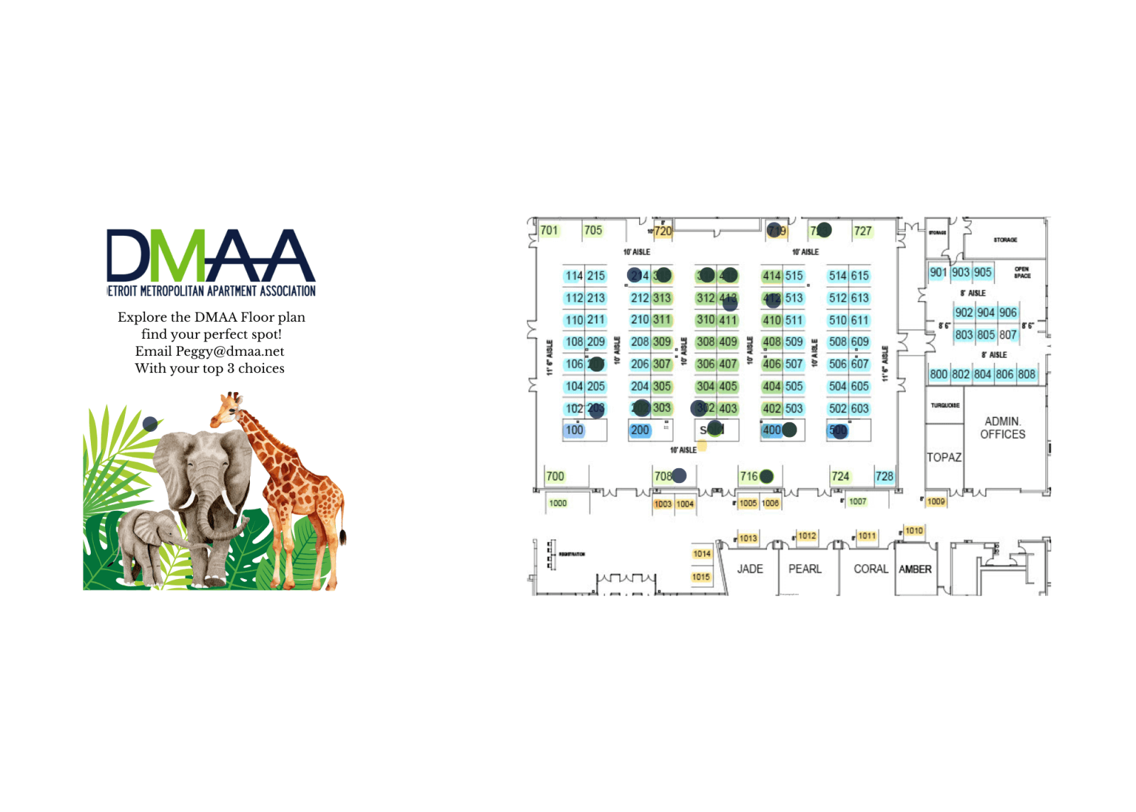 Once you’ve purchased your exhibitor ticket, please email us your top three booth choices. Booths will be assigned on a first-come, first-served basis, and our map will be updated daily as spaces are reserved.